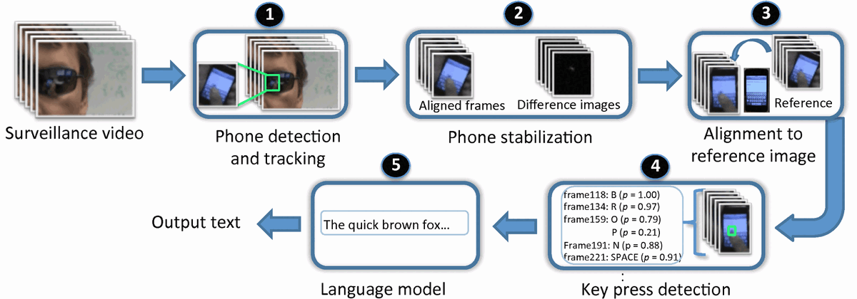 Есть любопытная статья On the Privacy Risks of Virtual Keyboards: Automatic Reconstruction of Typed Input from Compromising Reflections, она платная, но поисковик вытащил из нее картинки