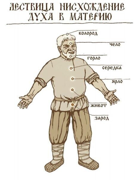 А теперь немного о том, как наши предки представляли собой сотворение человека и его «состав»… Согласно славянским мифам, нашей внутренней сутью является Ведогонь - тонкая ниточка света Духа Рода самого, вокруг нее намотаны три ядра - три «царства» Души. И она едина в своих трех ликах. А уже ядра эти, уплотняясь в своем вращении вокруг Ведогоня, как нить вокруг веретена, «створожили», сотворили тель - плотное физическое тело. Которое есть всего лишь уплотнившееся сознание. К душе есть 9 ключей - колодцев-выходов, а также крыниц дополнительных сил для нее - Стогн (на Востоке именуемых чакрами). Подробнее: русская народная сказка «Три царства медное, серебряное и золотое», а также работы А.Шевцова по самопознанию и очерки по прикладной народной психологии.