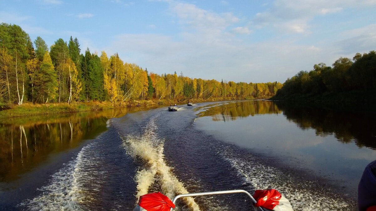 На улице окончательно выглянуло солнце, мы уже позавтракали и уложили вещи в лодку, а почему бы нам не посмотреть, что нас ждет впереди? Конечно нам интересно и мы запускаем квадрокоптер, да чего же красива тайга осенью, а река очень извилистая! Налюбовавшись красотами с высоты птичьего полета, спускаем квадрик и тут из-за поворота видим лодку, деревянную, узкую и длинную, мужики нас сразу предупреждают, что в реке очень много коряг и обратно нам идти будет очень сложно уровень воды упадет, но мы не стали раскрывать секрета, что обратно мы пойдем уже на водометах! Прощаемся с мужиками, доделываем дела и в путь! Но перед этим мы еще делали пробные заезды, в нашей лодке получилось груза чуть больше 1 тонны и максимальная скорость получилась 28-30 км в час, когда мы ходили на Полярный Урал у нас загрузка была 950 кг и мы могли идти 42 км в час. Тестами мы довольны вполне, на глиссер с 4-х лопастным винтом лодка выходит очень быстро, во время тестового заезда успели уже зацепить дно, а что нас ждало дальше ого го:)