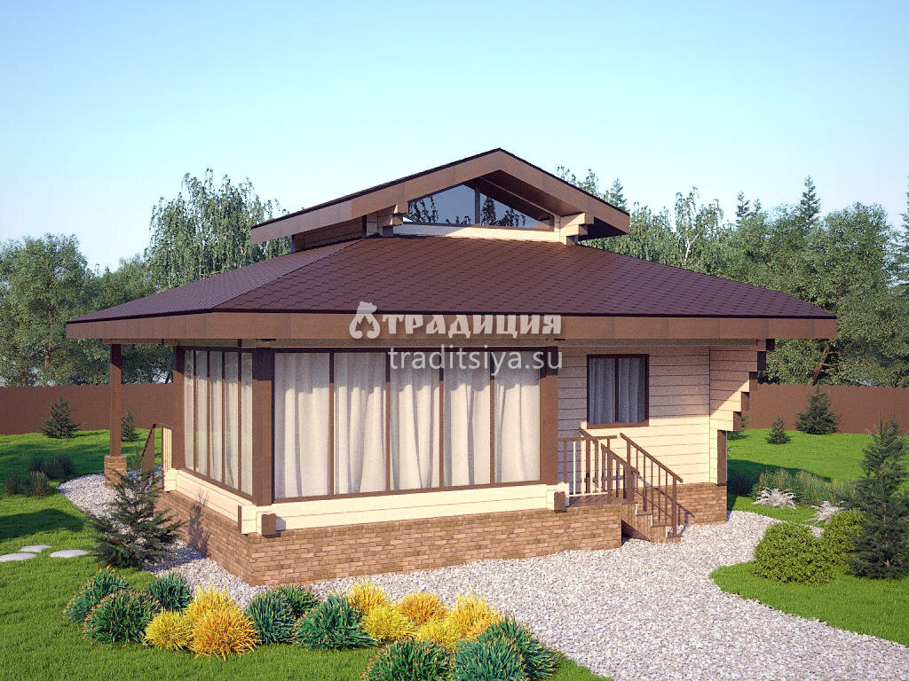 Одноэтажный дачный домик очень экономичен в строительстве, а экстерьер этого дома отличается оригинальными архитектурными решениями. Небольшой мезонин с двускатной крышей напоминает башенку, придавая строению большую легкость и изящество. При этом планировка жилого пространства рациональна и продуманна. Гостиная с панорамным остеклением занимает угол дома, кухня находится в отдельном помещении, две изолированные спальни имеют выход в общий холл. Привычный для горожан уровень комфорта обеспечивает санузел, в доме предусмотрены 2 входа. В качестве строительного материала используется профилированный брус, отличающийся наилучшими показателями экологической безопасности и теплосбережения. Подробнее: https://traditsiya.su/projects/ds-063