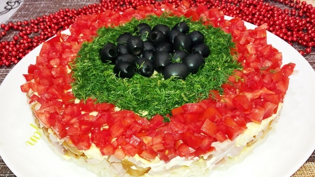 В круг кладем укроп и маслины. Быстрый и вкусный салат на праздничный стол готов. Приятного аппетита!
