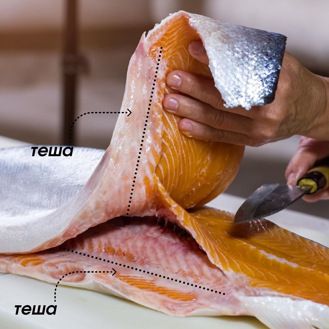 Каждая часть рыбной тушки имеет своё название. Теша (или же тёша, можно и так и так) – это брюшки или точнее крайняя жирная часть брюшка рыбы (фотографии ниже) В основном этот термин применим к лососевым и осетровым видам рыб. Между прочим, некоторые считают эту часть самым «смаком», в то время как другие наоборот от неё открещиваются. Почему так? Просто эта часть – наиболее жирная, что зачастую и отпугивает некоторых любителей рыбы, однако нельзя забывать, что жир в рыбе является прекрасным источником витаминов A, D, PP, B1, B2 и редкого витамина В6, а также натрия, калия, фосфора, железа и жирных кислот Омега-3, а потому может быть очень полезным. Теша и правда достаточно калорийная (около 200ккал/100гр), но, что удивительно, может помочь в борьбе с ожирением, ведь именно кислоты Омега-3 отвечают за распред