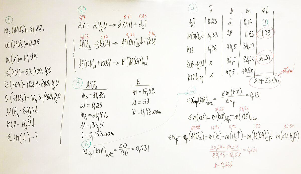 К раствору хлорида алюминия массой 81,88 г с массовой долей соли 25% добавили 17,94 г калия. Раствор охладили до 10°С. Определите массу и состав выпавшего осадка, если известно, что растворимость хлорида калия, гидроксида калия и хлорида алюминия при 10°С составляет соответственно 30 г/100 г Н2О, 102,4 г/100 г Н2О, 46,3 г/100 г Н2О. Хлорид алюминия выпадает из насыщенного раствора в виде гексагидрата, хлорид калия – в виде моногидрата, гидроксид алюминия не гигроскопичен.