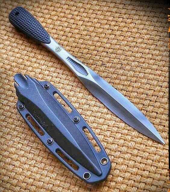Конечно это не рабочий нож, да и клинок рассчитан на единственный угол, геометрия позволяет без каких либо усилий беспрепятственно входить и выходить. У этого ножа обух сведен, а вот заточка отсутствует. Рукоять изготовлена из микарты. Ножны изготовлены из кайдекса, снабженные теклоком, это позволяет крепить нож в самых разнообразных вариациях.