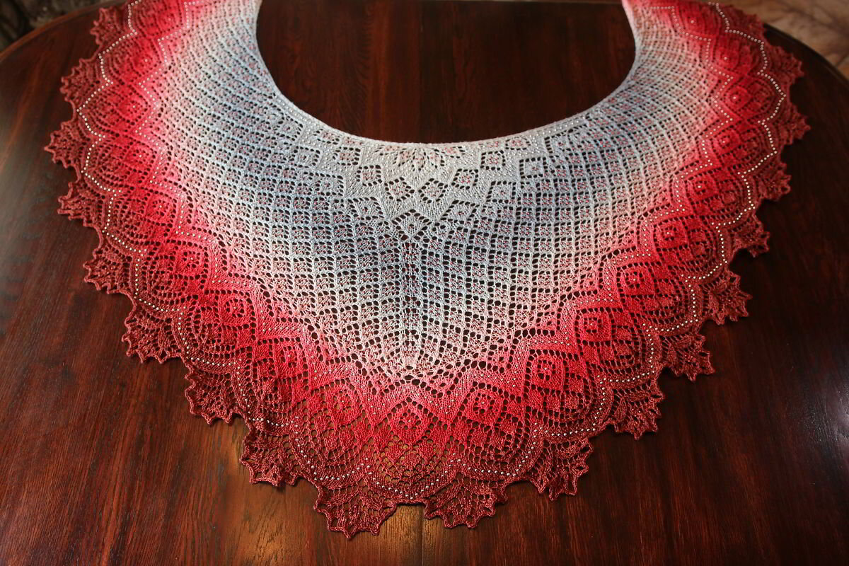 Серповидная ажурная шаль с бусинами, вязаная спицами сверху вниз, начав с наборного ярлычка, постепенно расширяясь к красивой кайме, словно россыпь кристаллов. Ажурный узор шали напоминает сверкающие кристаллы, которые являются символами энергии, жизнеспособности и силы. Шаль можно связать как маленькой, так и большой, как из тонкой пряжи типа паутинки, так и из пряжи средней толщины. Размеры шали легко изменить, добавляя или пропуская определенные схемы. Также имеется три вариации для основной части, которую можно связать изящным фантазийным ажуром, простым ажуром или просто лицевой гладью с бусинами. Описание