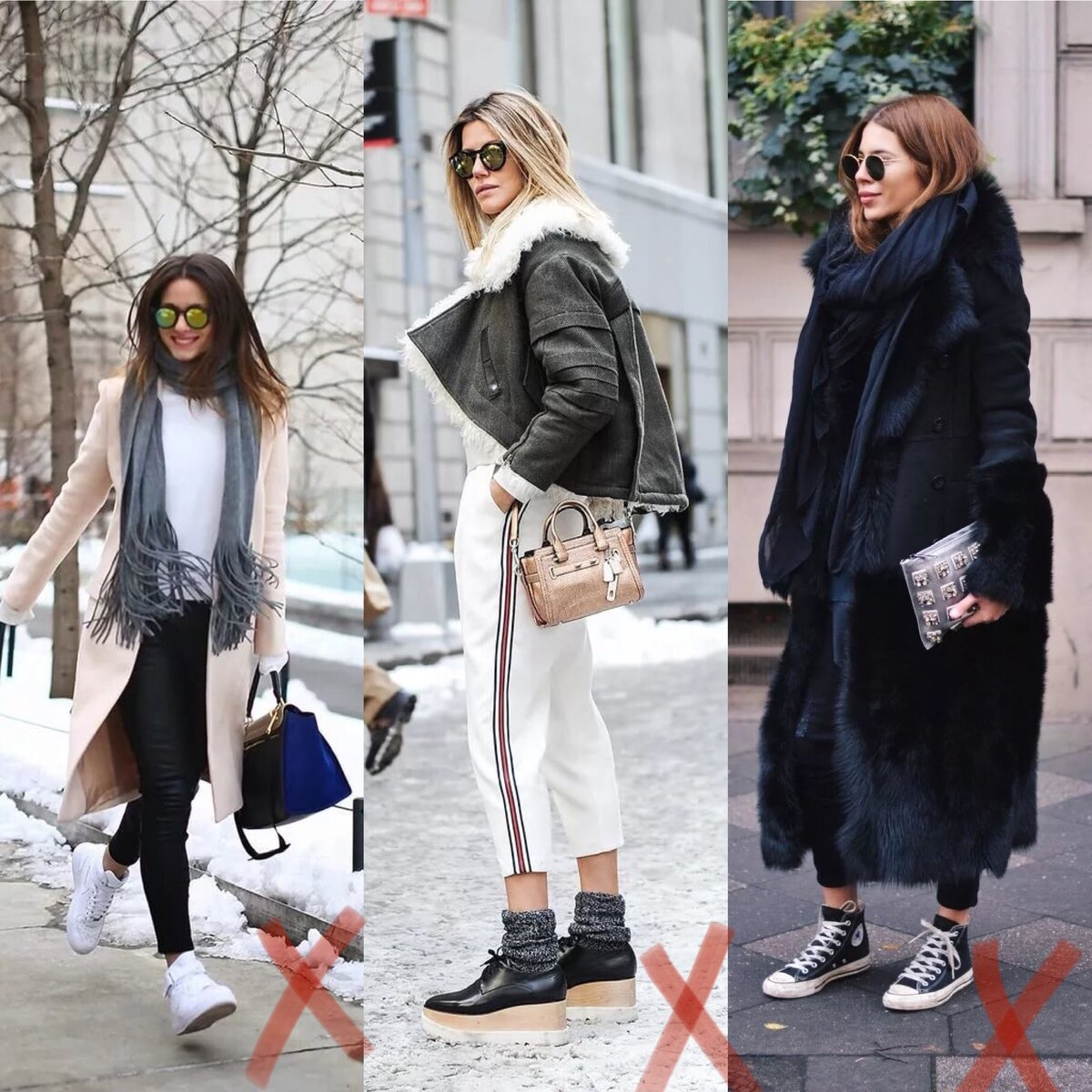 Различные вкусы в одежде - это все, конечно, понятно и имеет место быть. Но бывает увидишь на улицах такое, что объяснить это «вкусом» не представляется возможным. Рассмотрим примеры, как делать точно НЕ надо. Если вы поклонница качественной одежды известных брендов, то для вас существует уникальная платформа FARFETCH, которая объединяет в себе лучшие бутики стильной одежды. Сейчас у FARFETCH проходит финальная распродажа, не пропустите - ссылка. Итак, теперь поговорим про: Открытые щиколотки Откуда вообще пришла мода на открытые щиколотки - непонятно. Выглядит это смешно и странно: сверху полностью укутанная в шарф, шапку и пуховик девочка, а внизу голые ноги. И ладно бы это было просто странно и некрасиво, это ведь еще и ваше здоровье. Зимой носим теплую зимнюю обувь, и не забываем про носочки. Любой образ, даже самый стильный, будет выглядеть лучше с закрытыми щиколотками. Для сравнения похожие, но стильные образы: Пальто/шуба и спортивный рюкзак Да даже не спортивный, просто рю