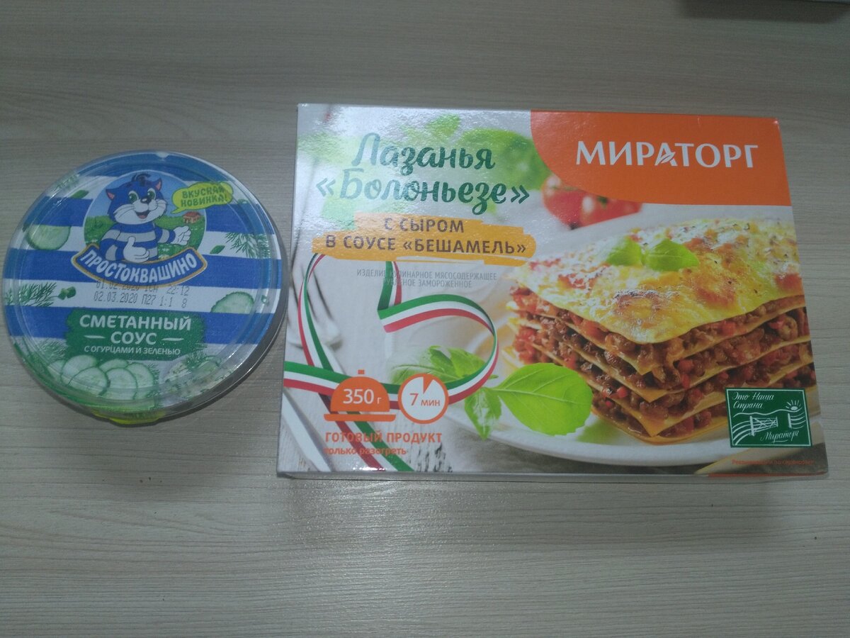 Забыла взять еду на работу. Купила по акции в Пятерочке для обеда на работе лазанью и сметанный соус с огурцами и зеленью