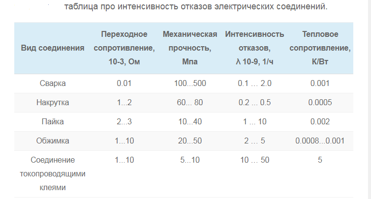 Были рассмотрены данные приведенные в нескольких справочниках, в том числе в электротехническом справочнике США. Цифры по интенсивности отказов сильно разнятся, поэтому их придется считать приблизительными. Возможно, это как-то связано с исследованиями по разным отраслям. Но ранжирование соединений проводов по интенсивности отказов сохраняется по всем справочникам.