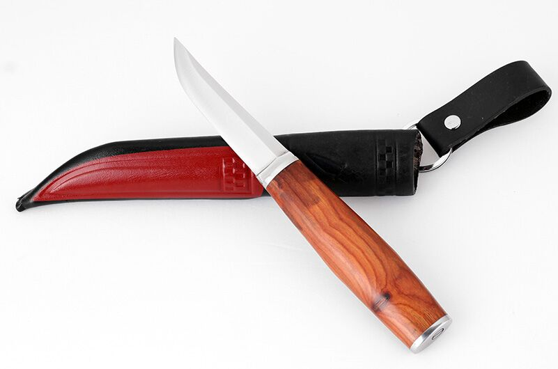 Здравствуйте, дорогие подписчики и гости канала! Сегодня у нас пойдет речь о ноже выполненном в скандинавском стиле, пуукко образной финочке от компании KKWOLF. Вообще подобные ножи это или любовь сразу и до конца, или полное неприятие подобного строя клинка. Но перейдем от слов к делу, т.е., к ножу. Нож имеет классический для пуукко клинок с высокими сканди спусками. Для изготовления клинка, применяется нержавеющая сталь 8Cr15Mov. Клинок закален до 59 единиц Hrc по шкале Роквелла, его длина составляет 85мм при толщине по обуху 4,2мм, а ширина 18мм. Полная длина самого ножа 195мм. Рукоять ножа так же классическая, в лучших финских традициях, но изготовлена она из палисандра. В сечении рукоять бочкообразная, что обеспечивает надежный хват как голой рукой, так и в перчатках. Через всю рукоять проходит хвостовик клинка, монтаж сквозной, на стяжку. Это обеспечивает достаточную надежность и уменьшает вес ножа в целом. Нож комплектуется вполне приличными кожаными ножнами, опять же выполненн