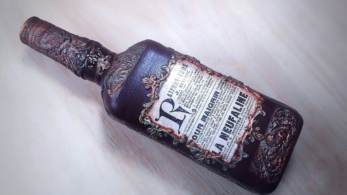 Винтажный декор превратит простую бутылку в приятный подарок и украшение интерьера. Работа с рельефной пастой, декупаж, многослойное окрашивание под металлическую поверхность. Использованные материалы: - Обезжиривающая жидкость; - Деликатный скотч; - Рельефная паста; - Декупажная карта; - Белила титановые; - Лак клей для декупажа; - Акриловый универсальный лак; - Акриловая краска (чёрный, махагон); - Самозатвердевающая глина; - Силиконовый молд; - Акриловые краски металлик (золото, медь, перламутровый зелёный)