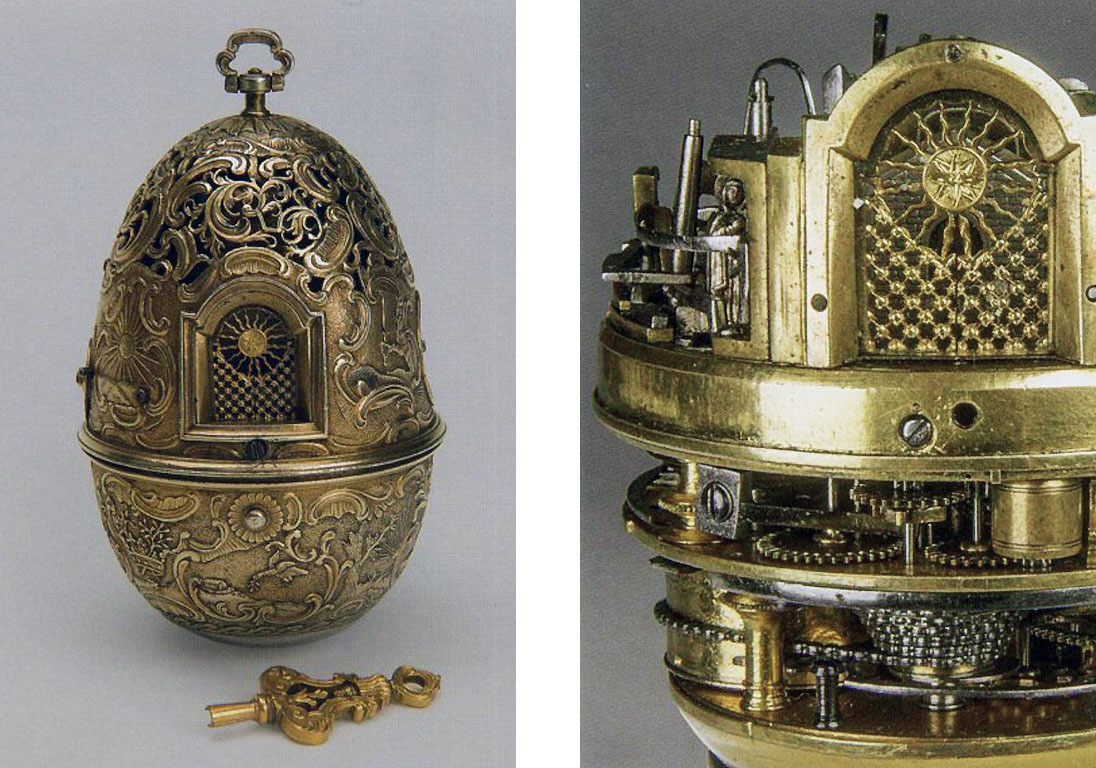 О часах 1767 года Все мы прекрасно знаем Кулибина (1735г. — 1818г.), русского механика, изобретателя, который сделал знаменитые часы «яичной формы», в подарок императрицы Екатерины II. Самое интересное, что внутри корпуса этих часов находится уникальный механизм. Он состоит из 427 деталей, эти часы не только показывают время, но и отбивают часы вполовину и четверть часа, а также в них заключен крошечный театр автомат. В конце каждого часа внутрь корпуса открываются маленькие створчатые двери и представление разыгрывается автоматически но и, конечно же, представление на библейскую тему, якобы пещера с гробом господнем, входная дверь привалена камнем, по бокам находятся стражники, камень отъезжает в сторону, стражники падают лицом вниз, с 2х сторон появляются ангелы и девы, и с их явлением куранты играют 3 раза мелодию молитвы Христос воскрес, после того как все стихло двери закрываются, для того чтобы через час снова повторить все это действо. В полдень, один раз в сутки час
