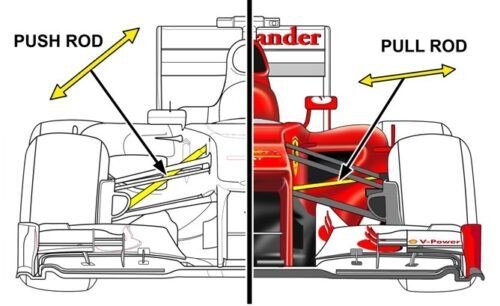 Начнем с технической части! Толкающая или тянущая штанга — наклонная тяга, расположенная между монококом и колесом. К стойке колеса эта тяга крепится в районе присоединения рычагов подвески. Каждое колесо соединено с одной штангой, на автомобиле обычно используют штанги одного типа — толкающие (push-rod) или тянущие (pull-rod). Сочетание штанг разных типов не применяют, так как эти механизмы имеют одинаковое назначение, но разное исполнение. Различие хорошо видно из названия. Тянущие штанги расположены иначе, они соединяются с рокерами, расположенными в нижней части монокока и крепятся к верхней части стоек колес, в районе крепления верхних рычагов подвески. Тянущие штанги были впервые применены в Формуле 1 Гордоном Марри (команда Brabham) в 1970-х. Преимущество тянущей схемы — в возможности сделать нос более низким, расположить большинство частей подвески ближе к дороге понижая таким образом центр тяжести. В настоящее время большинство команд используют толкающие штанги, поскольку тя