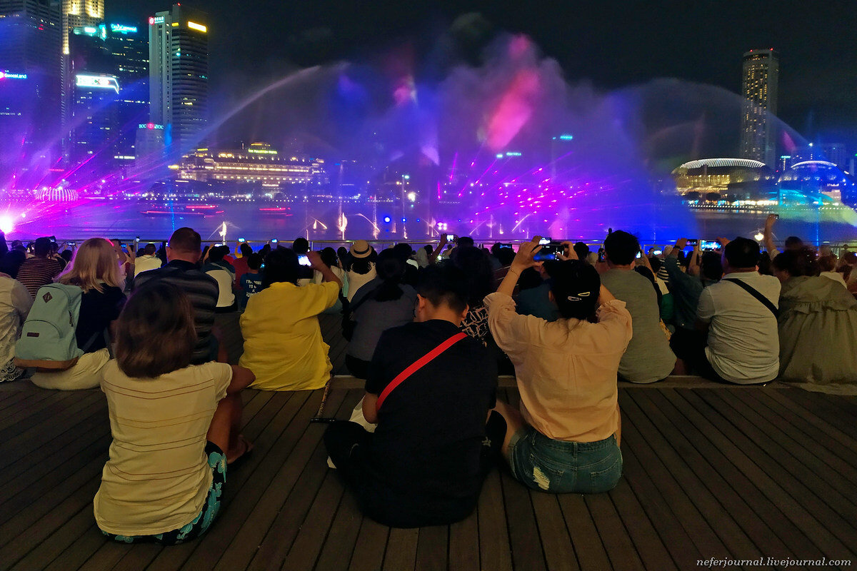 Представление проходит ежедневно. Желающих много, особенно в выходные. Но места хватает всем. Зрители рассаживаются на деревянные ступенчатые помосты и начинается свето-музыкальная феерия. Шоу длится минут пятнадцать. Примерно, как наш Круг Света, только мини-версия и круглый год.