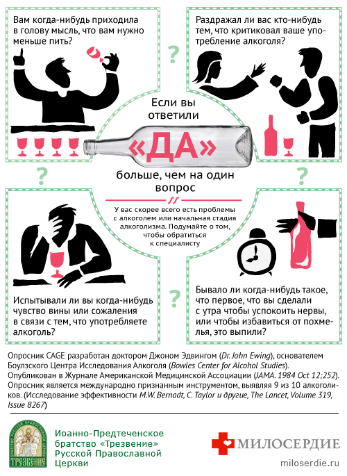 11.09.2019 / Илья ЮДИН, Кирилл МИЛОВИДОВ Тест из четырех вопросов, который выявляет 9 алкоголиков из 10. Если вы ответили «да» больше, чем на один вопрос – у вас могут быть проблемы с алкоголем Если вы ответил ДА больше, чем на один вопрос, у вас скорее-всего есть проблемы с алкоголем или начальная стадия алкоголизма. Подумайте о том, чтобы обратиться к специалисту! Справка: опросник CAGE разработан доктором Джоном Эдвингом (Dr. John Ewing), основателем Боулзского Центра Исследования Алкоголя (Bowles Center for Alcohol Studies). Опубликован в Журнале Американской Медицинской Ассоциации (JAMA. 1984 Oct 12;252). Опросник является международно признанным инструментом, выявляя 9 из 10 алкоголиков. (Исследование эффективности M.W. Bernadt, C. Taylor и другие, The Lancet, Volume 319, Issue 8267). Вам важно, чтобы разговор на эту тему продолжился? Поддержите портал! Мы просим подписаться на небольшой, но регулярный платеж в пользу нашего сайта. Милосердие.ru работает благодаря добровольным п
