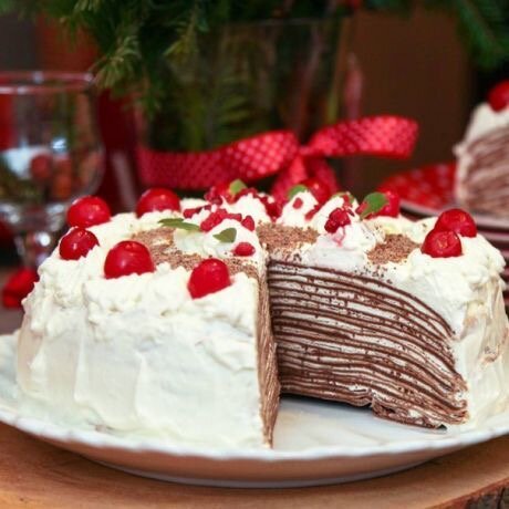Ингредиенты: На блины: яйца 3 шт сахар 70 гр молоко 250 мл вода 300 мл мука 250 гр масло подсолнечное 2 ст.л разрыхлитель 1 ч.л Для крема: сливки более 33% —250 гр маскарпони или другой сливочный сыр—130 гр сметана 20-25%—180 гр сгущенка 2 ст.л сахарная пудра 80 гр В прослойку: любые ягоды и фрукты Приготовление: Яйца с сахаром взбиваем, добавляем молоко и воду. Сухие ингредиенты перемешиваем и вводим в яично-молочную массу, взбиваем до однородности. Затем добавляем масло. Оставляем на 15-20 минут. Печём на медленном огне, очень тонкие блинчики. Наливаем половником на блинницу смесь, быстро распределяем по поверхности и остаток выливаем обратно к основной массе. Таким образом у нас получаются тонкие блинчики. Чем тоньше, тем нежнее торт. Жарьте секунд 5-7 с каждой стороны, ориентируясь на свою плиту. Блины должны быть бледными, что бы не быть жесткими. Пока печёте блины, готовые накройте пакетом , что бы они пропаривались и размягчались. Готовим крем: Смешиваем все