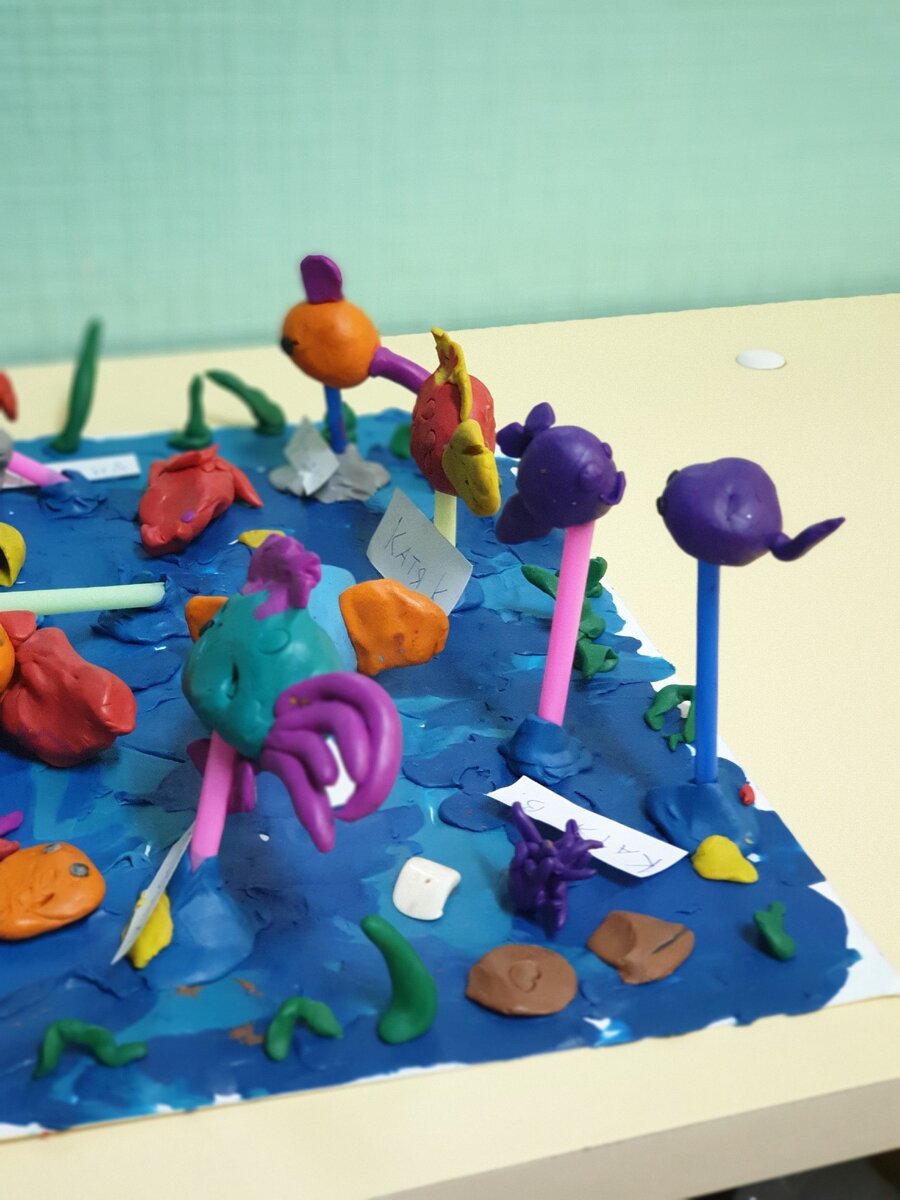 В детском саду моя дочь слепила из пластилина двух фиолетовых рыбок. Другие дети лепили осьминогов и китов. Тема была "Обитатели морского дна".