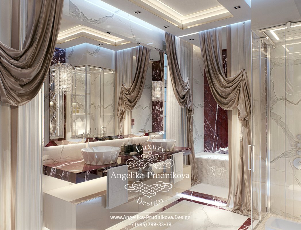 «Изюминка» интерьера ванной комнаты в загородном доме – мраморная отделка белого и винно-красного цвета. Такое сочетание выглядит динамично и создает праздничное настроение. Отполированный до глянцевого блеска мрамор хорошо гармонирует с зеркалами и хрустальными светильниками. А красиво задрапированные текстильные шторы превращают ванную комнату в уютный будуар.