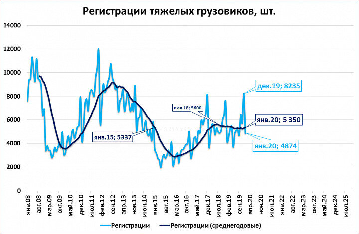 Автостат сообщил итоги января на рынке грузовиков https://www.autostat.ru/news/4... Если рассматривать только тяжёлые грузовики (полной массой более 14 тонн), то в январе по нашей оценке было зарегистрировано 4874 тяжёлых грузовика. Это на 17,7% больше, чем в январе 2019 года. Такие темпы роста не наблюдались с апреля 2018 года, и это уже второй месяц роста подряд. Продажи за последние 12 месяцев пока ещё ниже АППГ (-1,7%). Рост радует, однако надо учитывать, что пока рынок находится в узком диапазоне 62-68 тыс. шт. в годовом выражении. То есть дойдя до верхней границы диапазона (68 тыс.) он может с таким же успехом развернуться вниз. Но все эти падения и взлёты - лишь буря в стакане воды, на самом деле отражающая застой. Как и во всей экономике. В качестве математического упражнения: если рост 17,7% сохранится в течение года, то регистрации по итогам 2020 года достигнут 75 тыс. шт. Судить по одному месяцу, конечно, опрометчиво и даже наивно, но такой сценарий исключать нельзя.