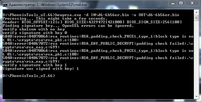 Сразу же небольшая ремарка: Для других ноутбуков, других производителей, других платформ алгоритм может меняться, но за частую не сильно. Качаем с сайта производителя BIOS. Он, как сейчас модно, упакован в exe-шник, внутри которого может оказаться еще один exe-шник. Прям, игла в яйце, яйцо в утке, утка в зайце, заяц в шоке!!! Первым делом надо распаковать exe-шники. Это можно сделать 7-Zip-ом, плагинами для FAR-а и Total Commander-а и т. д. У меня, к примеру, с каких-то давних пор установлен UniExtract, он тоже это умеет. Далее нам понадобится PhoenixTool. В его пакет входит программка hewprsa.exe, с ее помощью расшифровываем зашифрованный бинарник. Запускаем из командной строки: hewprsa.exe -d bios_in.bin -o bios_out.bin Где bios_in.bin это зашифрованный бинарик, а bios_out.bin - то что мы получим после расшифровки. На выходе получаем уже более менее читаемый бинарик, но, как сейчас модно, он в себе содержит прошивку основного BIOS-а (Main), прошивку для мультиконтроллера (EC) и еще