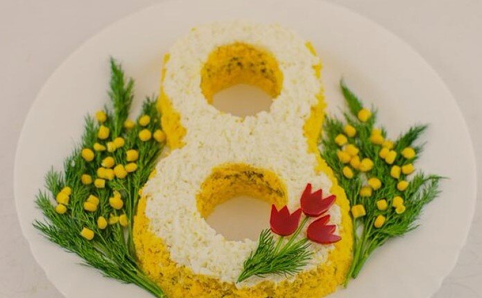 Вкусный салат из простых продуктов, но выложенный в форме цифры «8», станет колоритным украшением праздничного стола. В женский день такому салату обрадуются все гости, а особенно – прекрасные леди. Необходимые ингредиенты: • пачка охлажденных крабовых палочек – 200-250 гр;