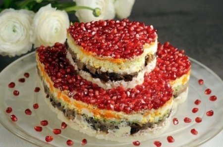 9 Собираем слоеный салат в салатное кольцо в виде сердца: На каждый слой наносим сеточку из майонеза: картофель, майонез, соленый огурец, куриное мясо, майонез, чернослив, грибы, яйца, морковь с чесноком, майонез, орехи, зерна граната. Также собираем салат в салатное кольцо в виде сердца маленький. И аккуратно перекладываем его на большое сердце. Украшаем зернами граната.