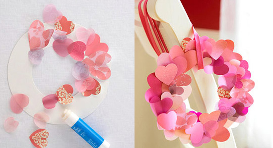 Вырезаем из простой белой бумаги круг, диаметром 30-40 см. Обклеиваем его вырезанными сердечками. Подберите сами необходимую тональность — венок можно сделать более нежный, используя сердечки белого и светло-розового цвета, а можно более страстный, выбирая красные и бордовые цвета. Можно сделать в модном сочетании розового и черного или в готическом стиле — используя черные и красные сердечки. Величину сердечек можно также подобрать разную — так венок получится более объемный и фактурный.