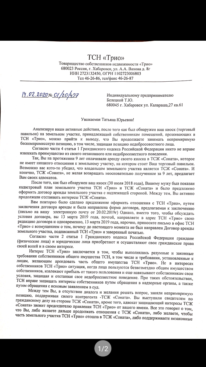Сегодня пригласил собственника торгового павильона "Продукты" Татьяну Юрьевну для переговоров в связи с начавшейся с их стороны "информационными сбросами" относительно нашего "уклонения" от заключения договора. Провели переговоры в позитивном ключе. Я выразил законную позицию граждан ТСН Трио в отношении заключения договора аренды со всеми торговыми нестационарными объектами по правой стороне подъездной дороги через ул.Вахова А.А. 8г. И изложил ее в виде информационного письма, врученого под роспись и направленного почтой России. Публикую для обозрения.