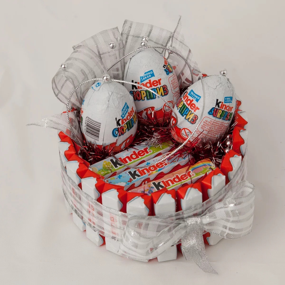 Нашего подарка . Либо можно сделать вместо ручки крышку с бантиком. Бант можно купить в цветочном магазине. Второй бант разрезаем на 4 части и делаем маленькие бантики . Заполняем корзинку вкусняшками и можно дарить . 2. Подарок мужу , либо на 23 февраля. Очень классный подарок . Когда лень что-то делать . И нет идей. Очень Лёгкий подарок. Понравится любому мужчине или подростку . 3. Подарок Любимой или Маме По мнению большинства этот подарок лучше всего подходит для наших неотразимых