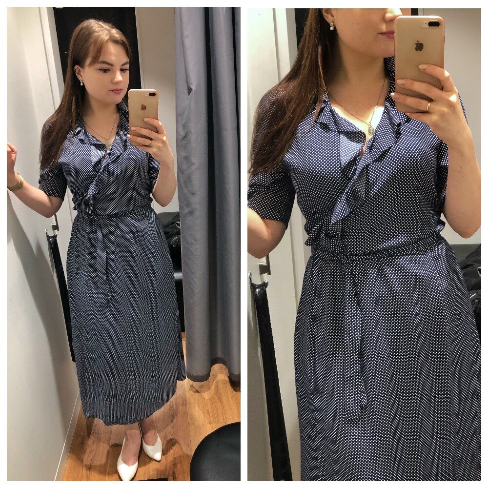 В каждой моей подборке подобное фигурирует. Длина миди, с запАхом, аккуратным воланом и принтом "горошек". Мне нравится, как платье подчеркивает талию, идеально для девушек, которым можно акцентировать внимание на пропорциях.