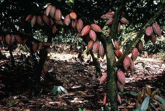 Дерево какао относится к семейству стеркулисовых. Растёт какао во влажных тропических лесах, достигая высоты 10-15 м. Листья этого вечнозелёного растения крупные и округлые. Когда смотришь на цветущие деревья какао, не перестаёшь удивляться: стволы деревьев и толстые нижние ветки как будто обёрнуты ярким костюмом с бразильского карнавала.