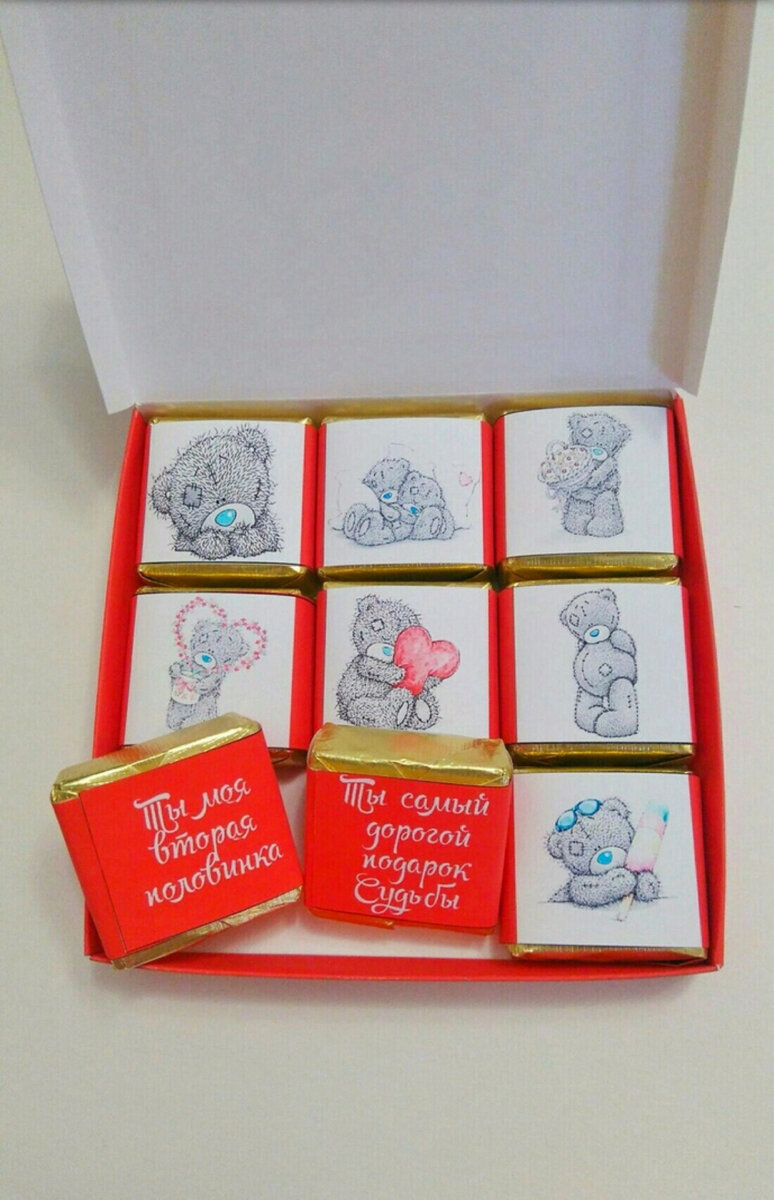 Подарок сделанный своими руками придёт подарку особую ценность, даже если это самые обычные конфеты. Вот такую прелестную коробку конфет можно приготовить за минут 20-30. Оригинально, интересно, красиво, со смыслом и ну ооооочень приятно и мило. Для этого вам понадобятся всего 9 конфеток птичьего молока от РотФронт. И два шаблона: Шаблоны на конфеты с милыми картинками и признаниями. Шаблон коробки упаковки. Распечатываем шаблоны. Шаблон коробки лучше печатать на картон. Вырезаем нужные картинки. С конфет убираем фирменную упаковку и вместо него клеем наши шаблончики. Красиво расскладываем в коробочке и подарок готов. Вот вам ещё один вариант шаблонов В дополнение к такому подарку отлично подойдёт письмо написанное вами лично. Ведь купить открытку каждый дурак сможет. А написать про свои чувства удел смелых и по-настоящему любящих людей. Вот вам несколько шаблонов красивых конвертов, куда вы можете положить своё письмо.