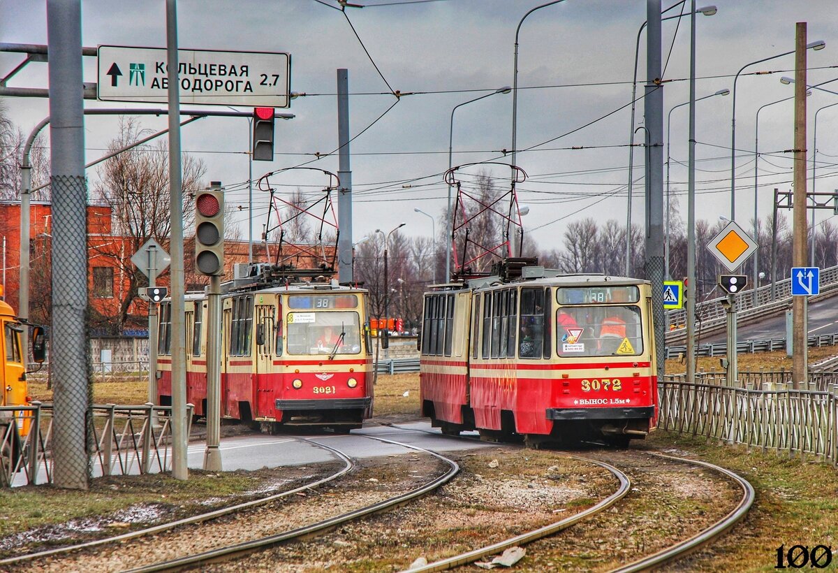 Переместимся в Калининский район — на пересечение Пискарёвского проспекта и улицы Руставели; через этот перекрёсток пролегают трассы трёх трамвайных маршрутов — 9, 38, 51 (интервал движения в часы пик по маршруту 38 начинается от 5 минут).