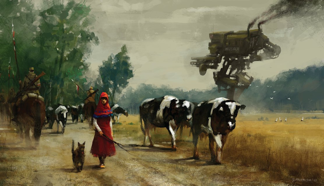 Вот уж кто смог совместить в своих работах детские увлечения, современные технологии и прикладную пользу. Перед нами обычный сельский пейзаж. Поля, холмы, коровы… и огромные боевые роботы. Дико, не правда ли? Но Якуб Розальски вполне органично совмещает в своих картинах историю и фантастику, реалии 1920-х годов и футуристическую технику. Начиная рисовать по классике на холсте и бумаге, со временем Розальски освоил и компьютерную графику. Свой стиль он называет своеобразной смесью импрессионизма и натурализма. Необычные сюжетные картины с боевыми роботами на фоне привычных нам пейзажей - это проект "1920+", в основу которого легла Варшавская битва 1920 года и Советско-польская война в целом. Несмотря на фантастичность картин, в них много достоверных фактов.