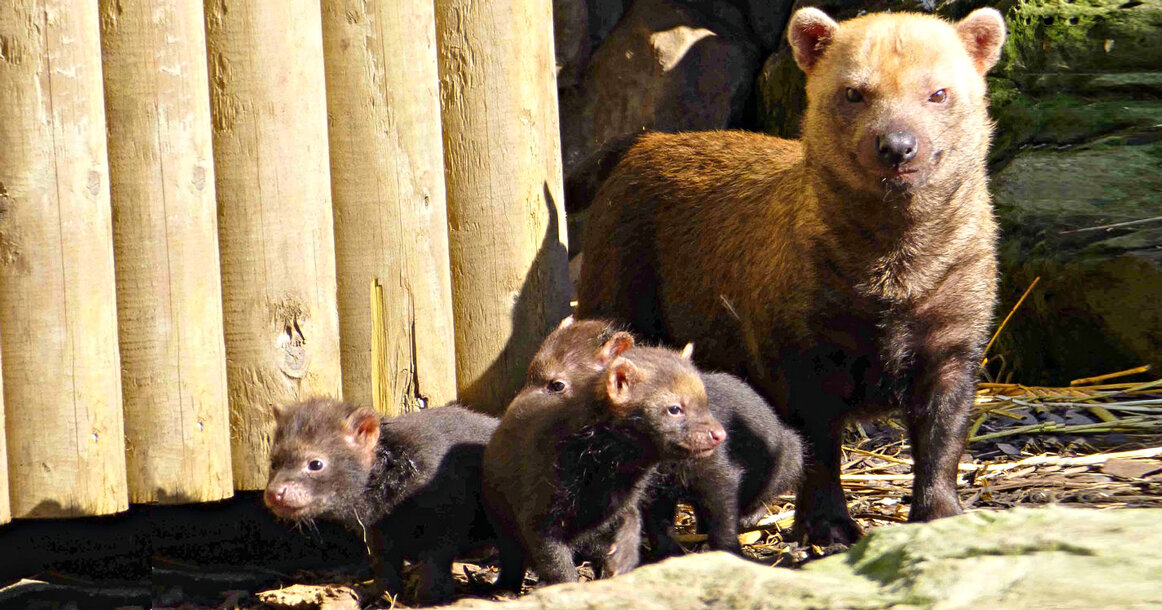 Собака, похожая на вомбата Во влажных тропических лесах Южной Америки живет необычный представитель семейства псовых - Кустарниковая собака. Эти ночные, норные животные очень общительны, живут и охотятся небольшими семьями. Хотя сами по себе собачки очень невелики, стаей способны загрызть крупных грызунов, птиц и даже тапиров. Без проблем могут преодолеть крупный водоем, а так же умеют нырять. Самцы в моногамной паре заботятся о самке и детенышах начиная от добывания пищи до помощи при родах. Коренные жители часто держали таких собак в качестве питомцев для норной охоты. Сейчас же эти собаки считаются личными псами лесного божества, поэтому их поимка или убийство резко пресекаются. несмотря на это вид остается очень редким и малоизученным.