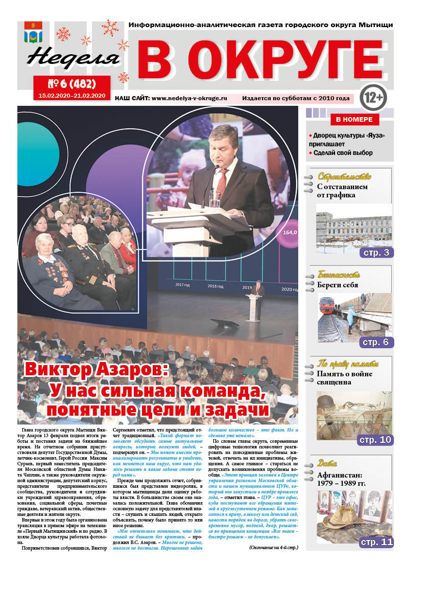 13 февраля во Дворце культуры «Яуза» глава городского округа Мытищи Виктор Азаров подвел итоги работы за 2019 год и поставил задачи на ближайшее время. Экономика, образование, культура и спорт. В его речи были затронуты все сферы нашей с вами жизни. С основными направлениями его отчета мы познакомим вас уже завтра в новом номере газеты «Неделя в округе».