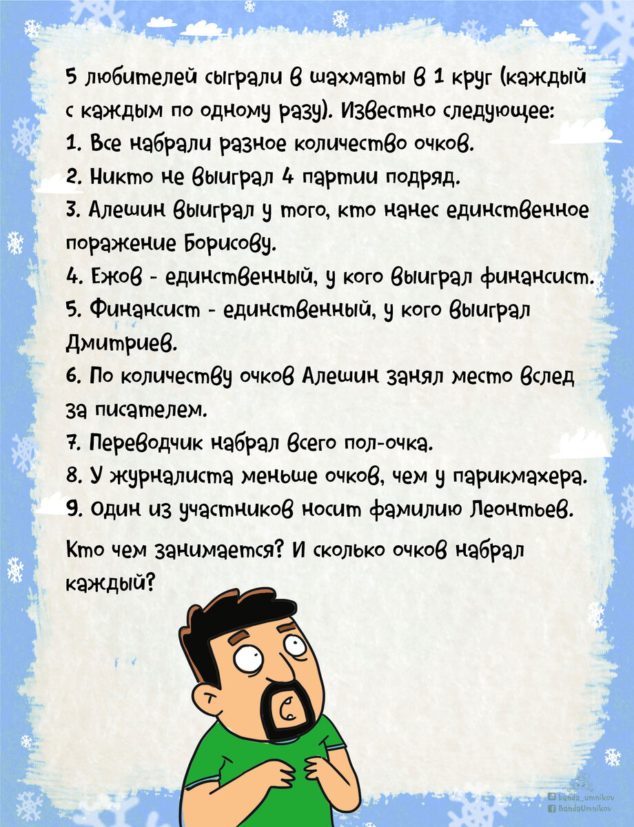 Задача про то, как финансист, переводчик и журналист в шахматы играли♟