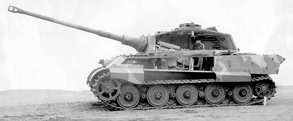 Танк "Королевский тигр" разработан в 1943 году фирмой "Порше" и с 1944 года начал поступать в германские войска дополнительно и взамен танков "Тигр". Так же, как и его предшественник, "Королевский тигр" был вооружен 88-мм полуавтоматической пушкой, однако длина ее ствола была увеличена до 71 калибра, что обеспечило получение начальной скорости бронебойного подкалиберного снаряда 1000 м/с. Такой снаряд на расстоянии 1000 метров пробивал броню толщиной до 200-мм. Кроме мощной пушки, танк имел и исключительно мощное бронирование, причем, учитывая опыт "Пантеры", конструкторы расположили броневые листы с рациональными углами наклона.