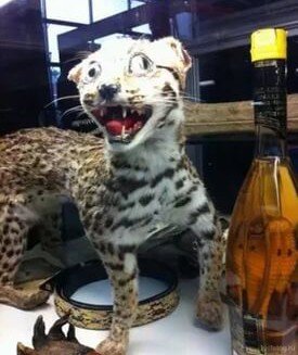 1. Ну вот яркий пример, тушка вроде как ничего, но вот выражение "лица", говорит что при жизни он был непрочь закинуть за воротник. 2. Здесь тоже самое, этот зверь больше смахивает на белочку (от слова белая), кошмар алкоголика. 3. У этого котика навечно застыло удивление, вопрошающее хозяина на кой чёрт он это сделал? Не мог хотя бы нормального специалиста найти? 4. При взгляде на этот шедевр, кажется что его просто надули воздухом, как воздушный шарик, из-за чего кажется будто это самое крутое чучело среди всех чучел, этакий настоящий пацанчик среди чучел. 5. Этого тоже, как будто надули, но в отличии от предыдущего "шедевра", здесь крутизной даже не пахнет. Ну какая крутизна в шерстяном, пятнистом батоне вареной колбасы на тоненьких ножках-палочках? 6. И снова застывшее удивление, это что же такого я пыхнул, что попал сюда? Хотя нужно признать что тушка вышла неплохо. 7. Только взглянув на очередной шедевр, не только бросишь пить, курить, ........ , а ещё и срочно побежишь спортом