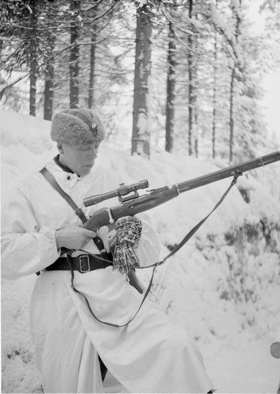 Кстати, вопреки сложившимся стереотипам, финские снайперы (будем называть их так, хотя снайперских школ, как таковых в Финляндии на тот момент не было) в Зимней войне чаще всего использовали обычные открытые прицелы. С оптикой труднее вести скоростной прицельный огонь (а стрелять кукушки должны были быстро — вдруг к блокированной колонне подкрепление подтянется), да и капризная она — то запотеет, то заледенеет… Да и в снегопад в оптику прицеливаться то ещё «удовольствие»…