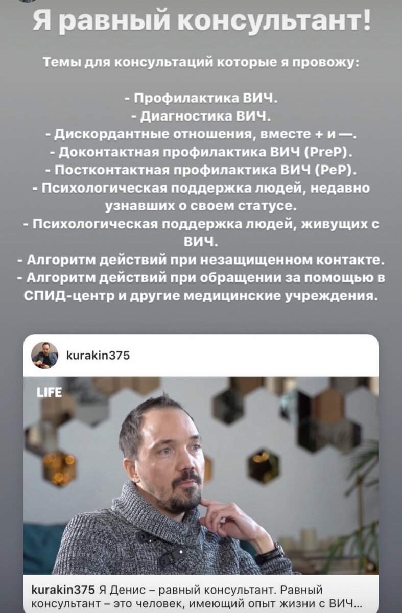 Я – руководитель и равный консультант ,, СО НКО БФ Дениса Куракина Азбука Эйч’’ Равный консультант – это человек, имеющий опыт жизни с ВИЧ и консультирующий других людей по этому вопросу. Равные консультанты оказывают неоценимую помощь людям, живущим с ВИЧ и врачам. Это энтузиасты своего дела, сопереживающие и поддерживающие, мотивирующие и заряжающие позитивом, утешающие и желающие поделиться личным опытом. Равное консультирование может проводиться как очно, так и заочно (по телефону и др.) в зависимости от возможностей консультанта. Равное консультирование осуществляется только на добровольной основе. ⠀ Что я могу? ⠀ - Поделиться опытом жизни с ВИЧ и лечения. - Поддержать морально, зажечь своей энергией. - Консультировать по вопросам, связанным с ВИЧ и СПИДом. - Мотивировать на лечение, приём АРВ-терапии и наблюдение, социальную и психологическую адаптацию. - Владею запасом знаний о ВИЧ-инфекции и ее клинических проявлениях. - Осведомлён о современных технологиях диагностики и л