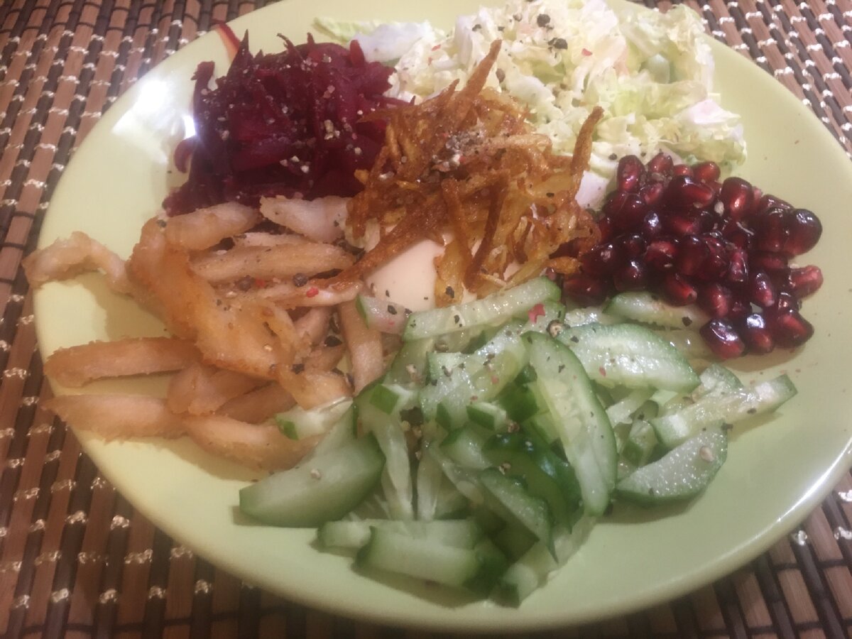 Добрый день друзья, думаю многим хоть раз приходилось встречать нежданных гостей... Когда нужно что то приготовить быстро, а главное вкусно. Сегодня поделюсь рецептом такого салатика. нам понадобится: любой салат (у меня китайская капуста) огурец гранат свекла любой мясо (в рецепте курица) хворост из картофеля Для этого салатика можно взять любое отварное мясо или например как я обжарить тонкие ломтики куриного филе. Нарезаем огурец и салат тонкой соломкой. Свеклу отвариваем и трём на терке (можно взять и свежую) Гранат разбираем на ядра. Для хвороста из картофеля нам понадобится: 1 сырая картошка натертая на крупной терке.. выкладываем полученную массу на салфетку чтоб убрать излишнюю влагу. Разогреваем достаточное количество масла в сковороде чтоб картошка была полностью покрыта и жарим до золотистого состояния. Все выкладываем на тарелку и посыпаем молотым перцем и солью. в середину кладём немного майонеза. Приятного аппетита