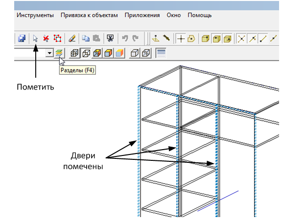 Сначала инструментом Пометить выделяем двери. Затем нажимаем кнопку Разделы. В появившемся окне нажимаем кнопку Новый раздел.