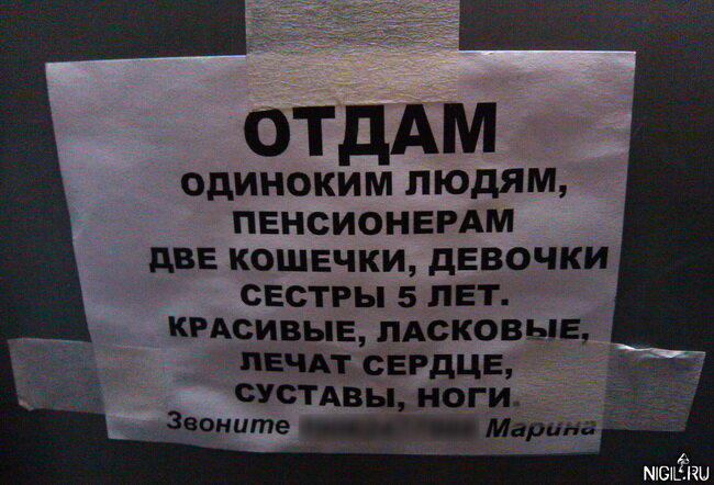 Такие вот объявления стали появляться в городском муниципальном транспорте Санкт-Петербурга в конце прошлого года: Расклеивают их мошенники. Вполне надёжный способ войти в доверие к одиноким людям, с последующим разводом на жилплощадь. Получение её в наследование - это в лучшем случае. Но вполне вероятно, что не всякий мошенник захочет дожидаться естественного хода событий, и для одиноких бабушек всё может пойти по более скоропостижному сценарию. По идее должно насторожить странное место для размещения объявления - сзади на спинке сиденья в муниципальном автобусе, хотя с другой стороны - почему бы и нет... Не ВКонтакте же бабушек ловить.. _________________________________________ Эту и другие статьи можно также читать на моём сайте: nigil.ru
