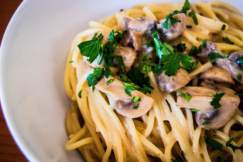 КБЖУ на 100 грамм блюда: Б - 4,8 г; Ж - 6,8 г; У - 12,3 г; 123,3 Ккал. Ингредиенты: - спагетти - 100 г; - свежие шампиньоны - 400 г; - сливки 10% - 250 мл; - соль по вкусу; - гранулированный чеснок по вкусу; - черный молотый перец по вкусу; - растительное масло для жарки; - вода для варки; - свежая зелень по вкусу. Способ приготовления: Отвариваем спагетти