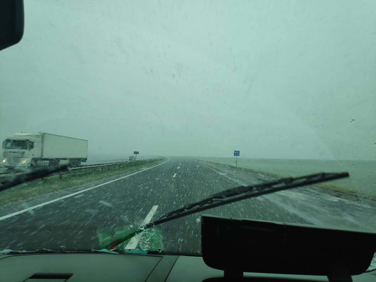Свободно проехали границу. Дорога хорошая, широкая и мало машин. Идёт дождь, переходящий в мокрый снег. По дороге метет, плохая видимость. Зато в нашем Новосибирске сейчас +15С. Через некоторое время пошел снег хлопьями. Дорога частично в снегу. Стали ехать медленнее. Нас обогнал Лексус, мы позавидовали его скорости, но не успел он отъехать от нас и 500 метров, как его занесло и он стал крутиться как юла на дороге… и в результате встал у обочины. В это время мы стали сбавлять скорость и только проехали мимо него, как нашего Соболя понесло в бок, так мы проехали немного и залетели на разделительную полосу дороги между попутным и встречным движением. Помогло покрытие из травы, на котором машина развернувшись р