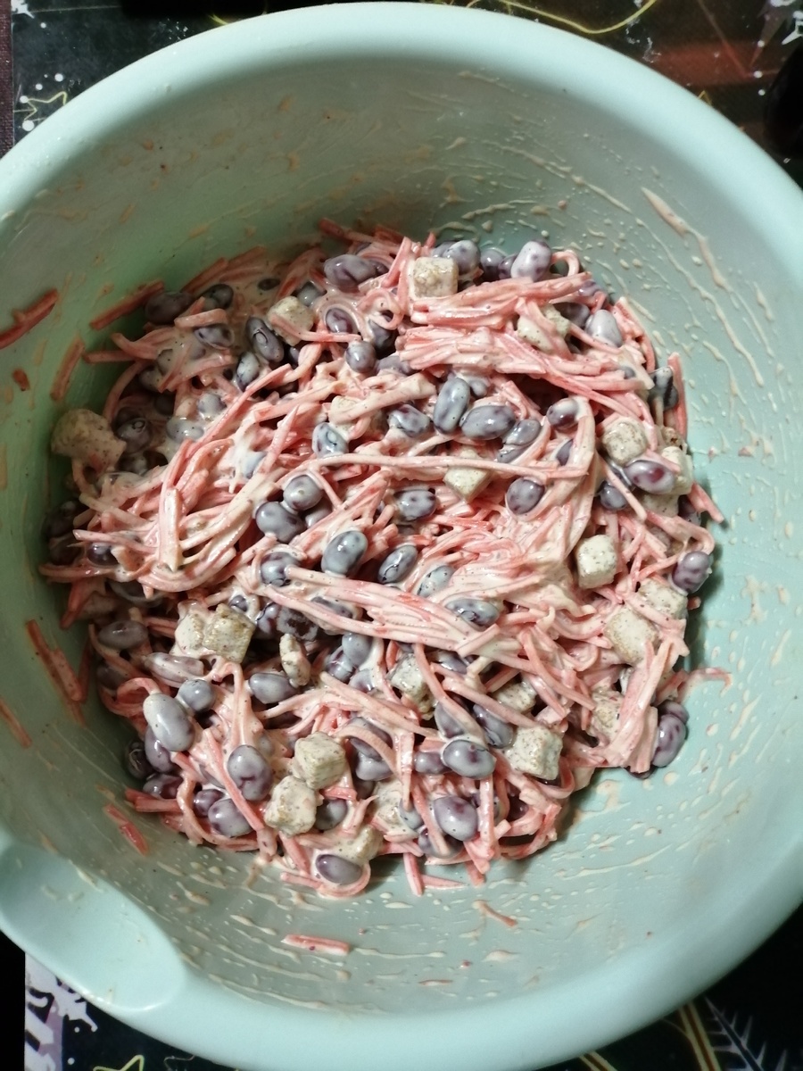 Всем привет!!! Делюсь рецептом быстрого, недорогого и, главное, вкусного салатика. Понадобится: 1 банка фасоли в собственном соку 200 моркови по-корейски 1 пачка сухариков (у меня "кириешки" со вкусом зелени) Майонез Приготовление: Морковь порезать, добавить фасоль, сухарики. Заправить майонезом. Хорошо перемешать. Можно по желанию добавить измельчённые грецкие орехи и зелень. Приятного аппетита. Если вам понравился рецепт, ставьте👍, подписывайтесь на канал, пишите комментарии. До новых встреч👋