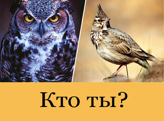 Этот тест предназначен для того, чтобы узнать в какое время суток ваша работоспособность находится на максимальном уровне. Это поможет вам организовать свой рабочий день так, чтобы избежать перегрузок. Выберите один из предложенных вариантов ответа. Вопросы 1. Можете ли вы вставать рано утром без напряжения? а) да; б) чаще всего; в) редко; г) нет; 2. Насколько раньше обычного вы ляжете спать, если с утра вас ждут важные дела? а) больше чем на 2 часа; б) на 1–2 часа; в) меньше чем на 1 час; г) как обычно. 3. В какое время вам удобнее всего ложиться спать? а) после часа ночи; б) с 23.00 до часу ночи; в) с 22.00 до 23.00; г) до 22.00. 4. Чем бы вы могли легко пожертвовать? а) утренним кофе; б) вечерним чаем. 5. В какое время у вас чаще всего могут возникнуть трения на работе? а) в первой половине дня; б) во второй половине дня. Инструкции Суммируйте полученные вами баллы. Результаты теста: До 7 баллов. Ваша работоспособность оптимальна в вечерние и даже ночные часы. Но г