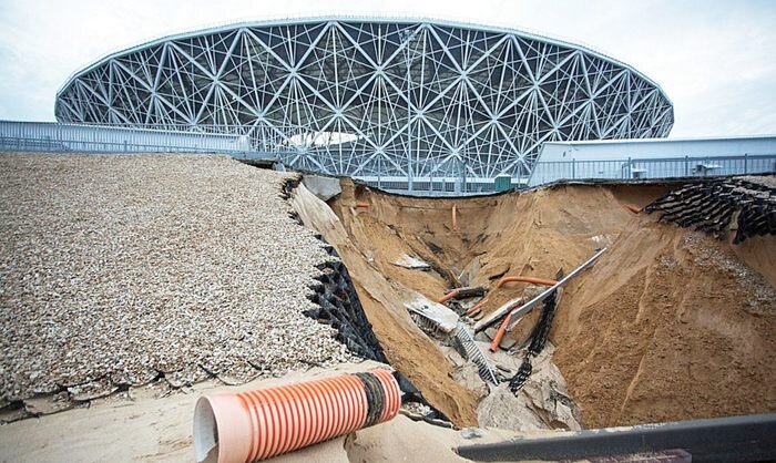 16 июля. Проезжающие мимо стадиона жители любуются сползшим в Волгу склоном, обнажившим те самые «коктейльные трубочки», играющие роль канализации. Заодно обнажается вся внутренность склона, и становится видно, что он был укреплен от дождей только строительным мусором и песком.