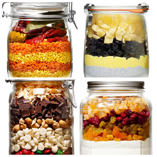 В стеклянную банку объемом 3/4 л. выложите слоями: 2 лавровых листа; 1 сушеный перец чили; 2 ч. л. куркумы; 1,5 ч. л. порошка карри (в закрытом саше или пластиковом пакете); 5 вяленых помидоров (не в масле); 1/2 ст. красной чечевицы; 1/2 ст. желтой чечевицы; 1/2 ст. красной чечевицы; 1/2 ст. желтой чечевицы Чечевичный суп с вялеными томатами и карри . В стеклянную банку объемом 1 л. выложите слоями: 4 нарезанных сушеных кольца ананаса; 1 ст. сушеной черники; 1/2 ст. мелкой желтой кукурузной муки; 1 ст. голубой кукурузной муки; 1/2 ст. муки высшего сорта; 2 ч. л. разрыхлителя; 1/2 ч. л. соды; 1 ч. л. соли Синий кукурузный хлеб с ананасами и черникой. В стеклянную банку объемом 1,5 л. выложите слоями: 1 ст. поджаренной кокосовой стружки; 1 ст. кусочков полусладкого шоколада; 1/2 ст. рубленых кешью; 1 ст. белых шоколадных гранул; 3/4 ст. красных и зеленых M&M's; 1/2 ст. алкализованного какао-порошка; 1,5 ст. муки высшего сорта; 3/4 ч. л. соли Суперсмесь для печенья. В стеклянную