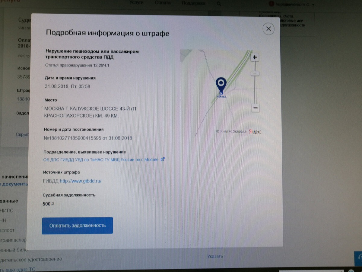 02.12.19 г., зайдя в личный кабинет на сайте Госуслуги, я с удивлением обнаружил, что 31.08.18 г. ОБ ДПС ГИБДД УВД по ТиНАО ГУ МВД России по г. Москве мне был выписан штраф 500 рублей за нарушение ПДД в г. Москва по статье 12.29 часть 1 КоАП РФ (исполнительный документ 18810277185900415595 от 31.08.2018) (смотрите файл 1 и 2). На свое обращение получил официальный ответ от командира ОБ ДПС ГИБДД УВД по ТиНАО ГУ МВД России по г. Москве майора Миркина А.Л.: постановление 18810277185900415595 вынесено в отношении гражданина Таджикистана Закиряева Тахиршо Саидовича (паспорт гражданина Таджикистана 400263838), а не в отношении гражданина России Чередниченко (паспорт гражданина России 04 00 263838) (смотрите файл 3). Информация на сайт Госуслуги направляется автоматически из Федеральной информационной системы ГИБДД и, следовательно, ошибок быть не может (смотрите файл 4). Я связался с операторами на сайте Госуслуги, где мне заявили, что штраф передан ГИБДД и выписан на паспорт гражданина